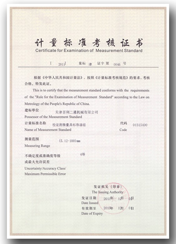 計(jì)量標(biāo)準(zhǔn)考核證書(shū)