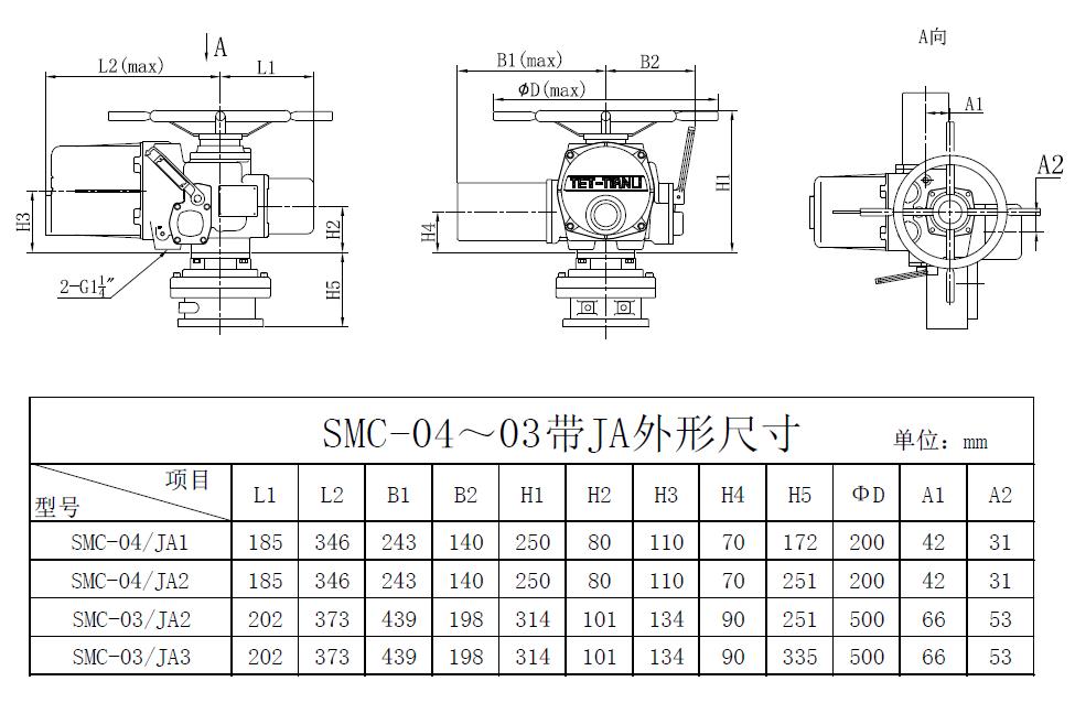 SMC/JA系列閥門電動裝置是部分回轉型閥門電動裝置,適用于球閥、蝶閥等類型閥門以及電動風門。其結構形式為組合式,由SMC多回轉電動裝置與JA部分回轉減速裝置相組合而成。該系列產品所適用的環境條件、溫度、濕度、海拔、防護等級均能達到SMC相應規格產品的水平。